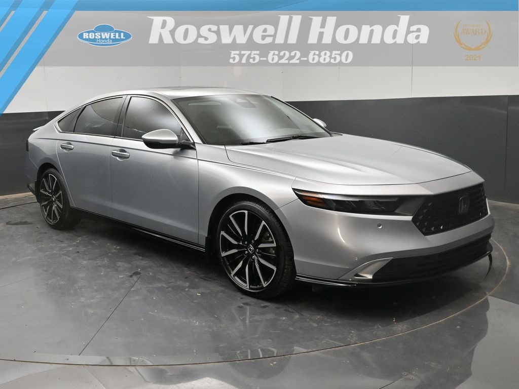 Roswell Honda has been proudly serving Roswell, Artesia, Carlsbad and Southeastern New Mexico for over 20 years. For more information on this vehicle please stop by the dealership at 2177 West Second Street or call us at 575-622-6850. This 2024 Honda Accord Hybrid Touring is loaded with the following Factory Options:12 Speakers, 4-Wheel Disc Brakes, ABS brakes, Adaptive Cruise Control: Adaptive Cruise Control (ACC) with Low-Speed Follow, Adaptive suspension, Air Conditioning, Alloy wheels, AM/FM radio, Apple CarPlay/Android Auto, Auto High-beam Headlights, Auto-dimming Rear-View mirror, Automatic temperature control, Blind Spot Information (BSI) System warning, Bose Premium Sound System, Brake assist, Bumpers: body-color, Compass, Delay-off headlights, Driver door bin, Driver vanity mirror, Dual front impact airbags, Dual front side impact airbags, Electronic Stability Control, Emergency communication system: HondaLink, Exterior Parking Camera Rear, Four wheel independent suspension, Front anti-roll bar, Front Bucket Seats, Front Center Armrest, Front dual zone A/C, Front reading lights, Fully automatic headlights, Heads-Up Display, Heated & Ventilated Front Bucket Seats, Heated door mirrors, Heated front seats, Heated rear seats, Illuminated entry, Knee airbag, Lane departure: Lane Keeping Assist System (LKAS) active, Leather Shift Knob, Leather steering wheel, Leather-Trimmed Seat Trim, Low tire pressure warning, Memory seat, Navigation System, Occupant sensing airbag, Outside temperature display, Overhead airbag, Overhead console, Panic alarm, Passenger door bin, Passenger vanity mirror, Power door mirrors, Power driver seat, Power moonroof, Power passenger seat, Power steering, Power windows, Radio data system, Rain sensing wipers, Rear anti-roll bar, Rear reading lights, Rear seat center armrest, Rear side impact airbag, Rear window defroster, Remote keyless entry, Security system, Speed control, Speed-sensing steering, Speed-Sensitive Wipers, Split folding rear seat, Steering wheel mounted audio controls, Telescoping steering wheel, Tilt steering wheel, Traction control, Trip computer, Turn signal indicator mirrors, Variably intermittent wipers, Ventilated front seats, and Wheels: 19" x 8.5J Berlina Black.